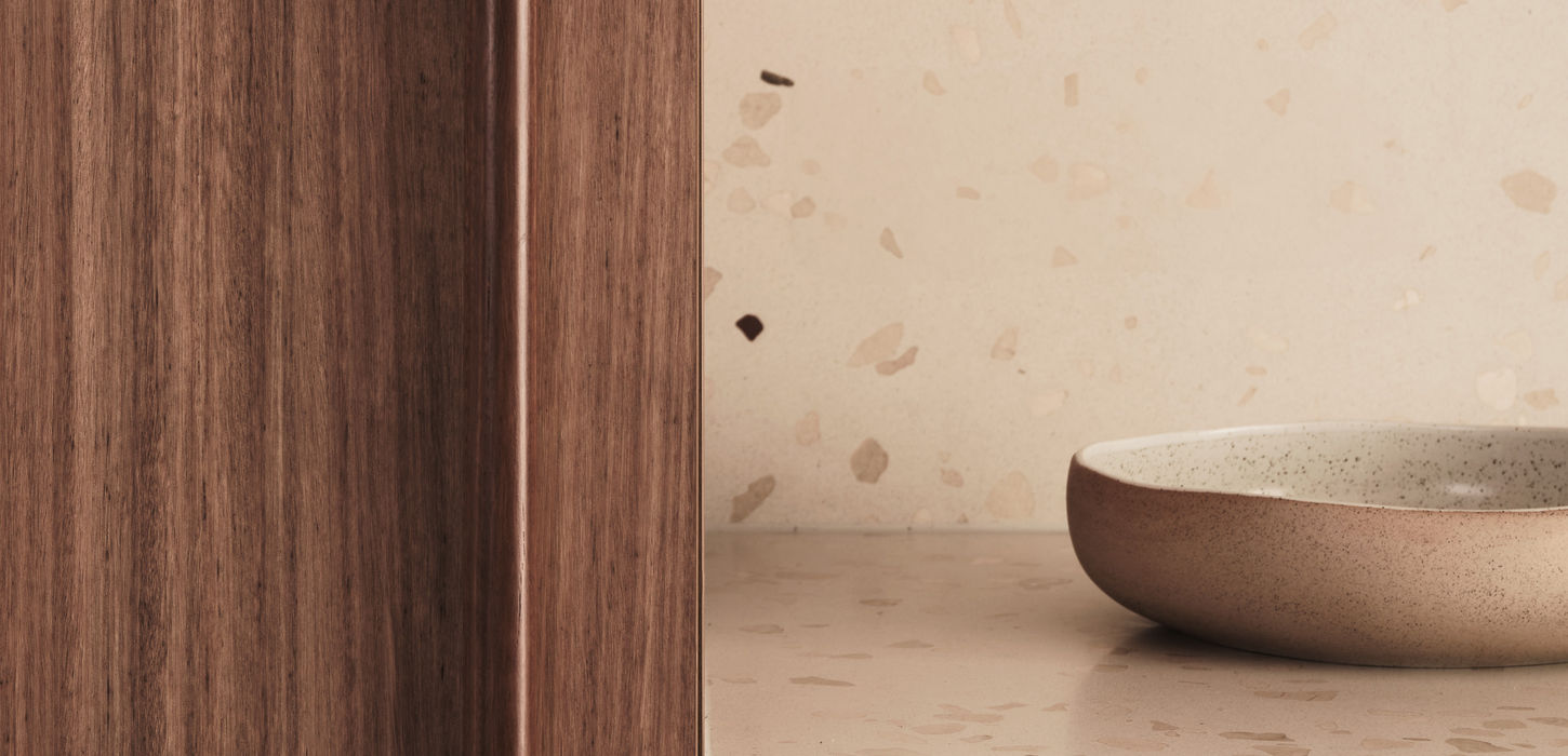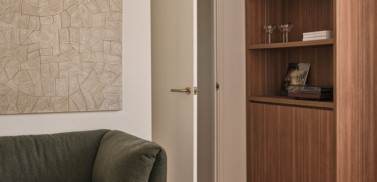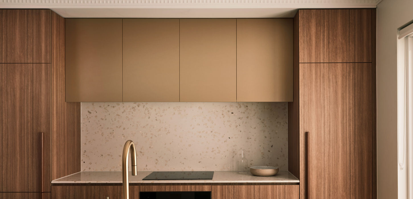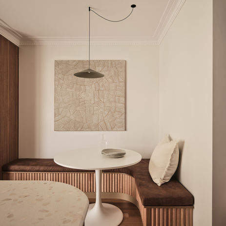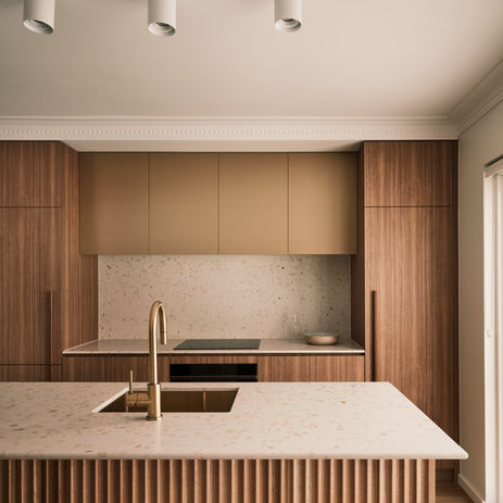 The palette is rich yet measured: fluted timber, soft pink terrazzo, and brushed brass lend texture and depth, while carefully considered detailing enhances intimacy without excess. Compact in footprint but generous in experience, Little Gold Living reflects how spatial clarity and character can co-exist in perfect balance.