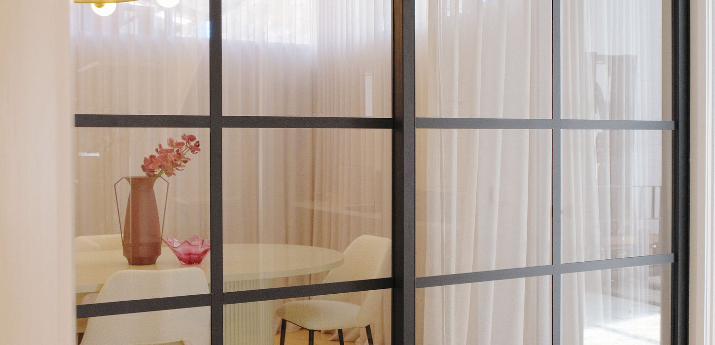 A striking pink staircase rises at the centre of the space, offering an unexpectedly playful moment that brings energy and creativity into the day. Nearby, a meeting room framed in black steel and glass introduces contrast and structure, softened by sheer curtains and a ribbed-leg table that brings both rhythm and warmth.