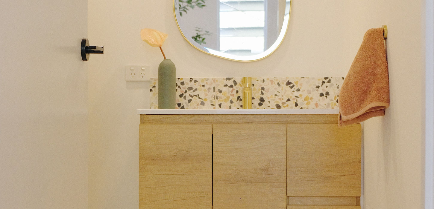 Material choices are layered and expressive. In the bathrooms, terrazzo tiles introduce visual texture, while a curved freestanding concrete basin, blush-toned brickwork and brushed gold tapware add depth and continuity. A second powder room pairs pale timber cabinetry with an organic mirror and soft flecks of stone in a palette that feels fresh yet enduring.