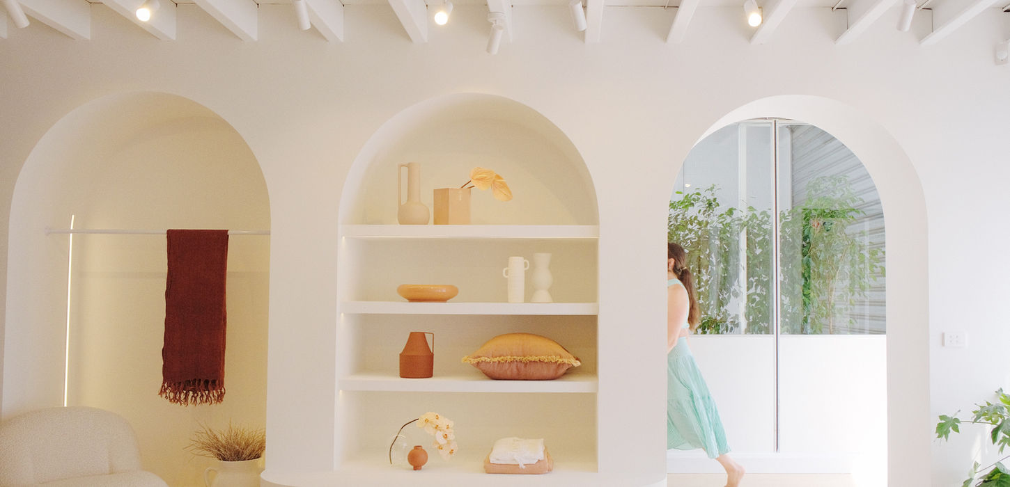 Movement, ritual and care are reflected in every detail. Arched walkways and curved joinery create a natural sense of flow. Sculptural shelving gives everyday objects a sense of quiet importance, while sheer curtains filter light across timber floors, casting a calm that shifts gently throughout the day.